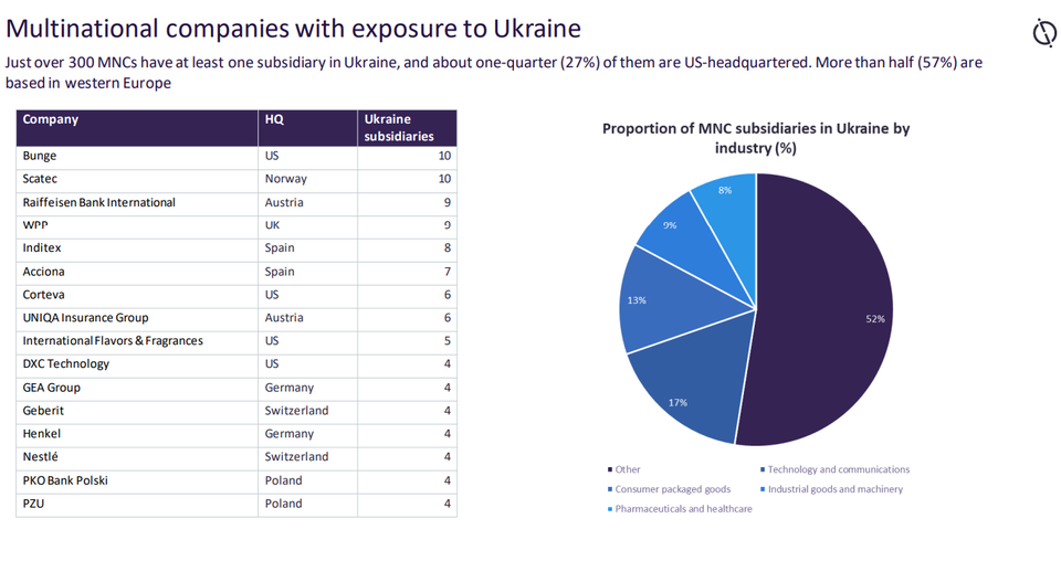 US-based agribusiness Bunge and Norwegian renewables firm Scatec are the two multinational companies with the greatest exposure to events in Ukraine, with 10 subsidiaries in Ukraine each.