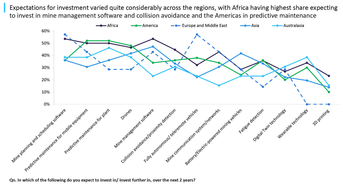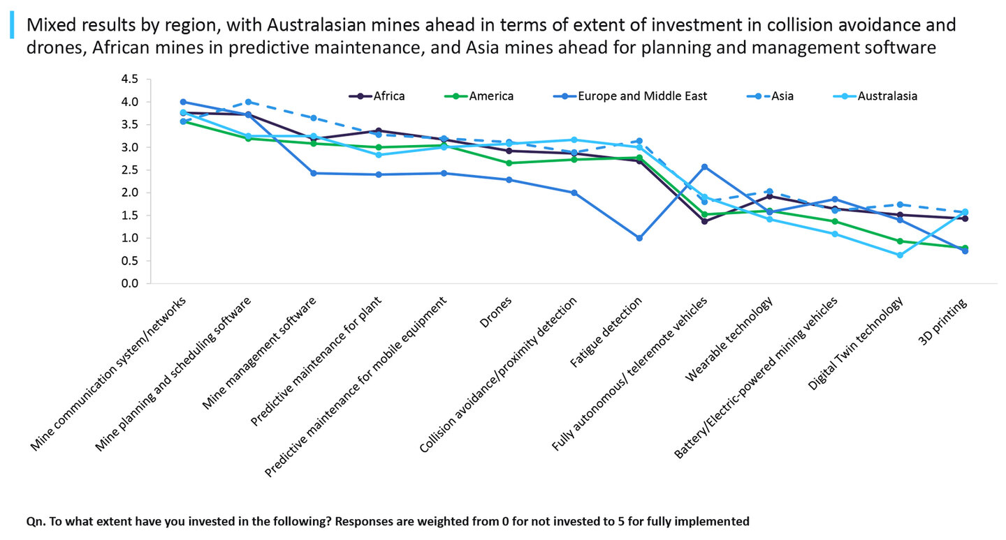 Conversely, the current momentum for investment in fatigue detection and collision avoidance is set to slow down in Australaisa, as attention shifts elsewhere. Investment in mine communication networks, which Australasian respondents said they have currently implemented the most, is also expected to attract less investment over the next two years. “Communication networks are amongst the most 'fully invested' of the technologies, so more mature in terms of investment already,” explains Kurtz.