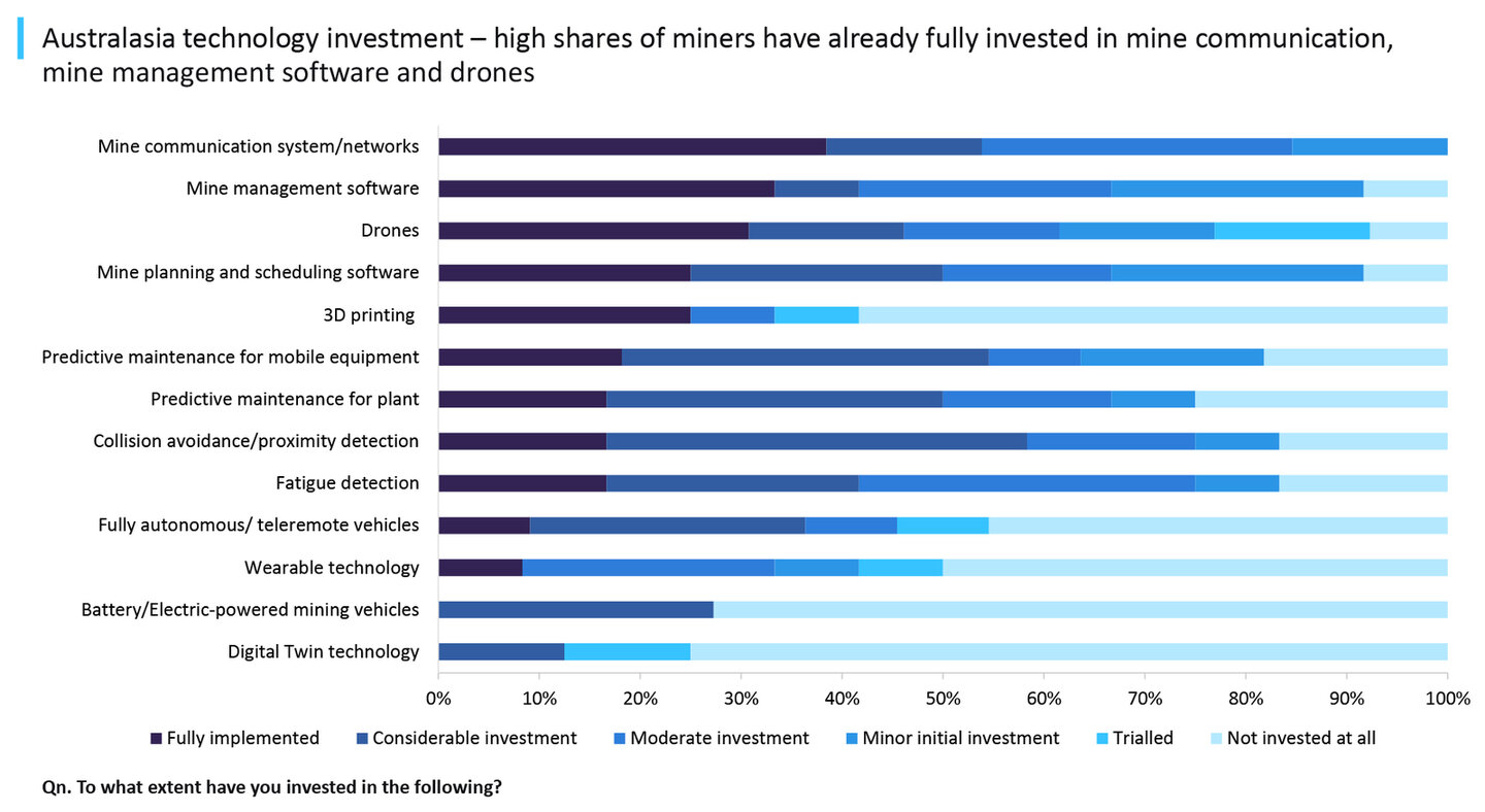 While only the big players in Australasia, such as Rio Tinto and BHP, are currently in the game (explaining the limited uptake by respondents) increasingly more miners are looking to invest in the technology as bigger companies demonstrate its potential.