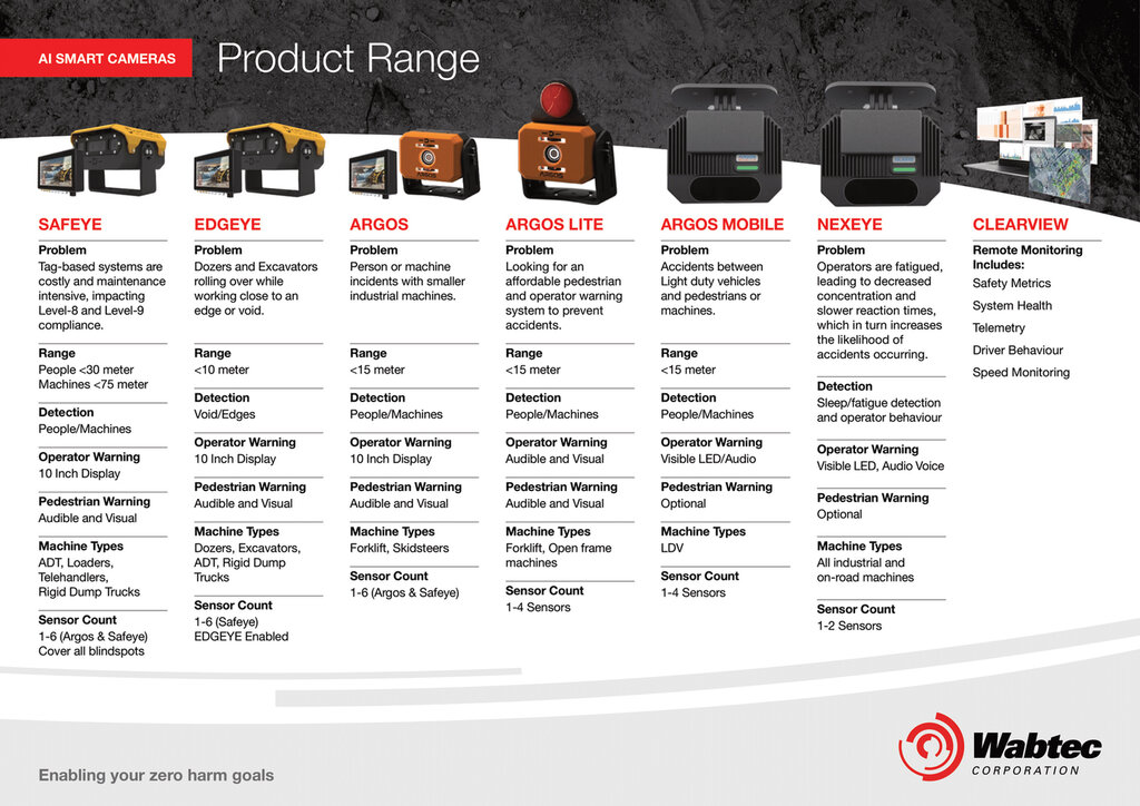 SAFEYE adds versatile stereoscopic detection, identifying people and machines across busy worksites for an easy, low-barrier entry into proximity awareness. EDGEYE uses stereoscopic vision to help dozers and excavators detect edges and voids. ARGOS brings people-and-machine detection to smaller industrial fleets like forklifts and skid steers. NEXEYE monitors fatigue and operator behaviour in real time.