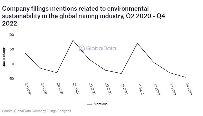 The global mining industry experienced a 45% drop in mentions of environmental sustainability made in company filings in Q4 2022 compared with the previous quarter. Despite this, Mineral Resources accounted for the largest single share, with a 24% year-on-year increase, according to GlobalData’s analysis of over 1,236 mining company filings.