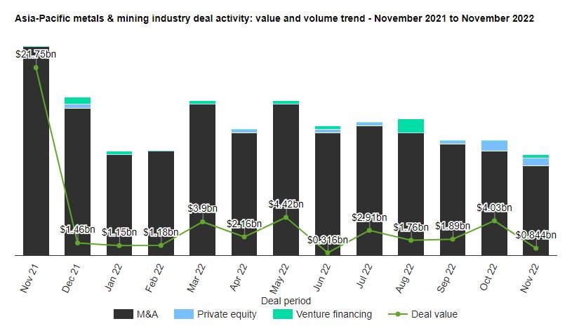 Asia-Pacific’s mining industry saw a drop of 26.32% in deal activity in November 2022