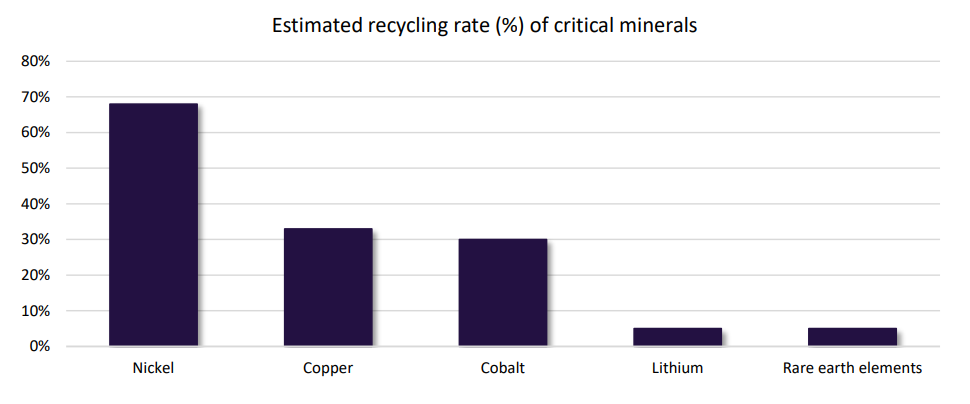 The low recycling rate of critical minerals is likely to exacerbate shortages, according to GlobalData. Source: GlobalData, International Copper Study Group, Nickel Institute, Recycling International