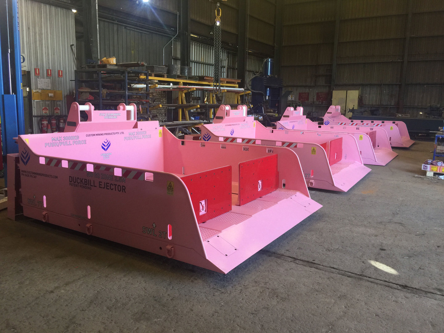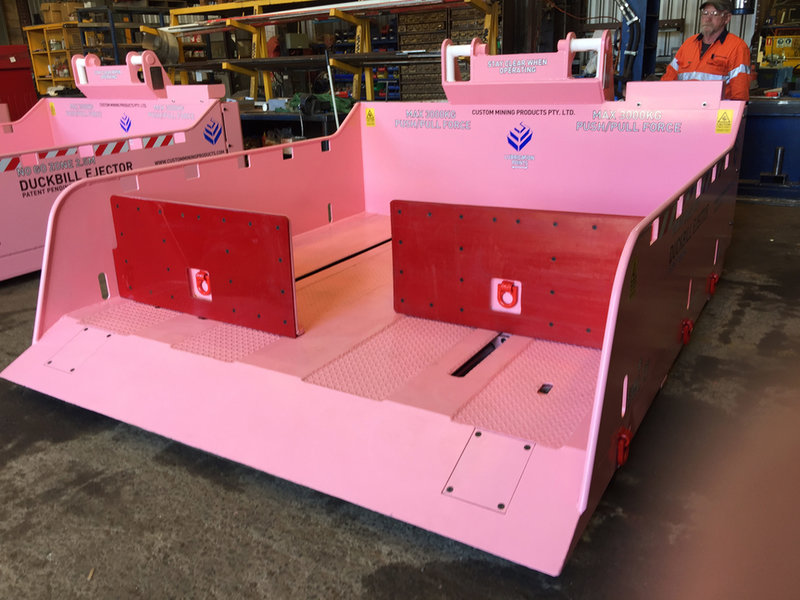 Custom Mining Product’s QDS Duckbill Ejector is designed as a safe and efficient means of carrying, ejecting and retrieving palletised products and bulky loads in a underground mine.   It is designed to carry a load of 6000kg and includes using hydraulically operated pusher plates to eject and retrieve a load in a controlled manner.