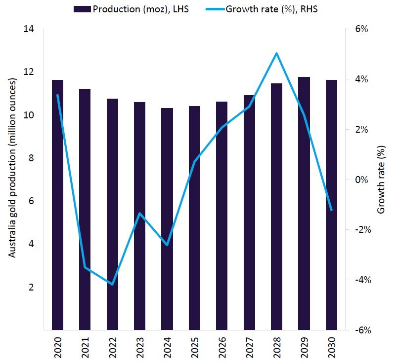Forecast for gold production in Australia to 2030. Source: GlobalData, Australian Department of Industry, Science and Resources