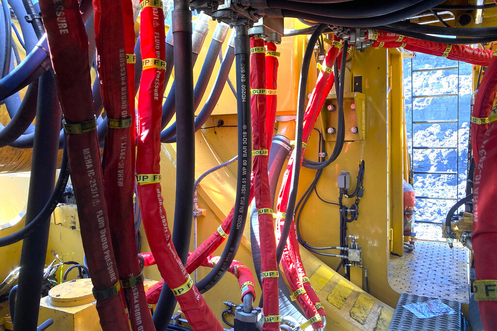 HNA Group Burst Sleeve Kit installed on a CAT 6040: The custom-engineered hydraulic protection kits are designed to safeguard critical circuits without unnecessary bulk coverage.