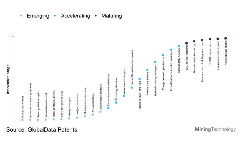 Within the emerging innovation stage, defect detection techniques, energy demand optimisation and magnetic route detectors are disruptive technologies that are in the early stages of application and should be tracked closely. Hydraulic mining conveyors, tunnel safety devices and tunnel lining construction devices are some of the accelerating innovation areas, where adoption has been steadily increasing. Among maturing innovation areas are CAD for drill planning and SCARA robotic arms, which are now well established in the industry.