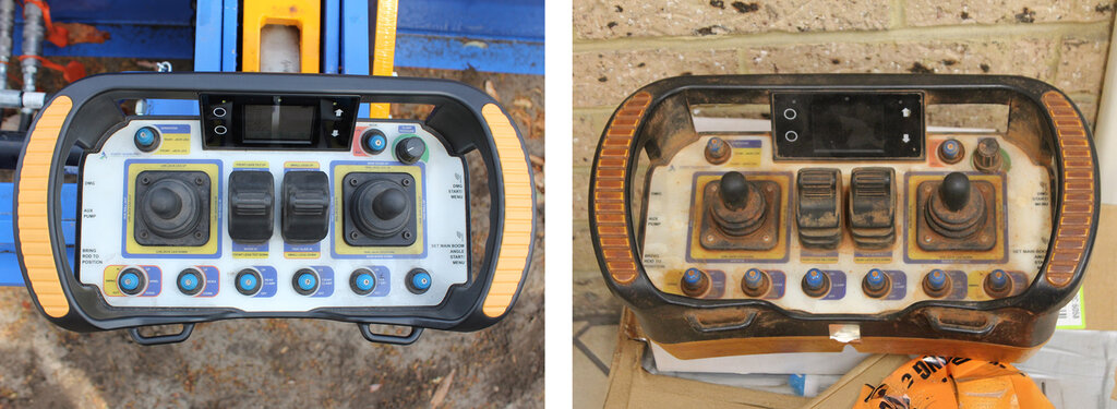 A brand new remote control (Figure 1). Alongside one that has seen real action -covered in dust and dirt- fully functional (Figure 2).