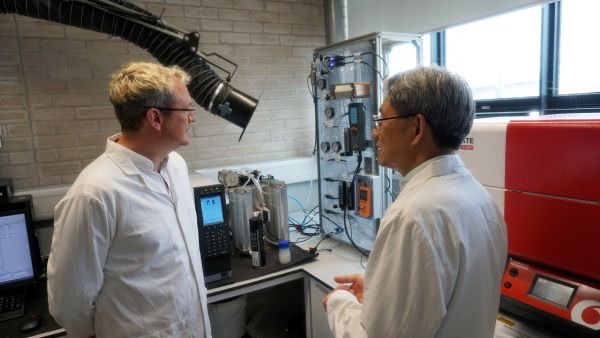 Grant Budge, CEO of PeroCycle, and Yulong Ding, the inventor of the technology, standing infront of a prototype reactor. Credit: University of Birmingham Enterprise