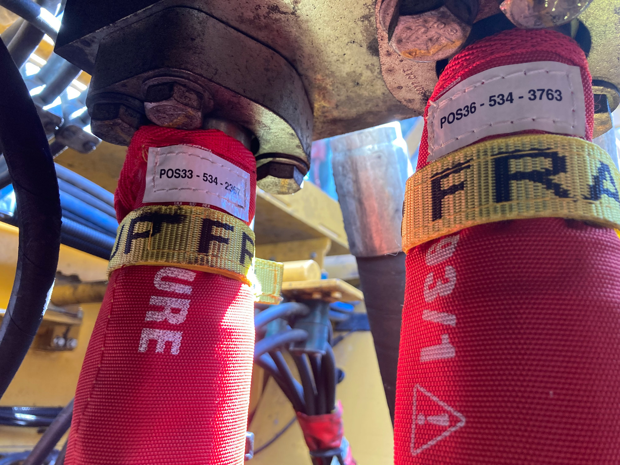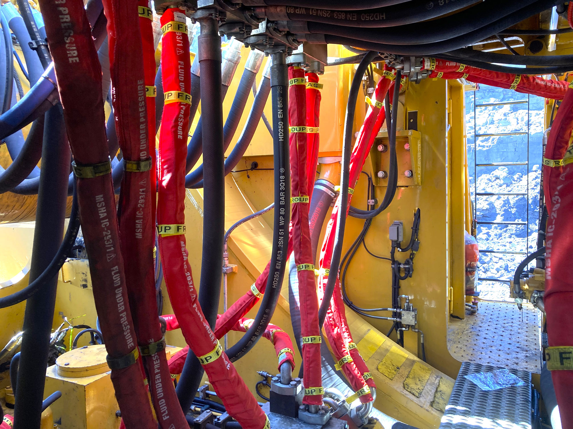 HNA Group Burst Sleeve Kit installed on a CAT 6040: The custom-engineered hydraulic protection kits are designed to safeguard critical circuits without unnecessary bulk coverage.