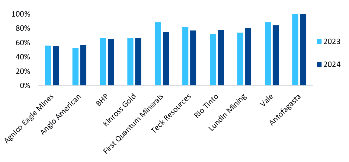 However, some miners continue to lag. In 2024, of the companies that recorded renewable electricity consumption, Solidcore Resources (formerly Polymetal International) and Barrick Mining Corp. registered the lowest percentages, at 1% and 7%, respectively. Barrick Mining experienced the most significant decline in its renewable electricity share from 2023 to 2024, dropping from 25% to 7%. Despite the company investing over $775m in low-carbon infrastructure, the restart of operations at Porgera and the ramp-up of activities at Pueblo Viejo have led to an increased reliance on fossil fuels in 2024.