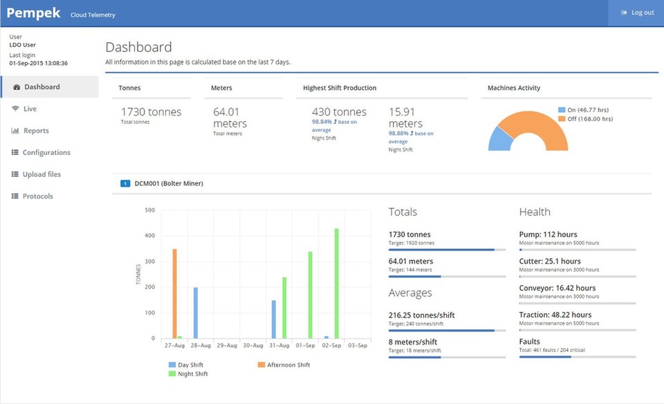 The system can be connected to the Internet where machine data is collected, stored and analyzed. Machine owners can then access maintenance and production data and reporting via mobile devices from anywhere in the world.