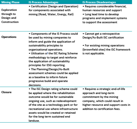 Through assessment of typical mining activity components progressively through each mining phase against relevant credit elements, the IS Process could provide a comprehensive, flexible, and scalable methodology that can provide meaningful metrics to inform a mining organisation’s ESG reporting. However, the prescriptive nature of the ISC process requires significant capital investment and a long lead time. Additionally, the focus on infrastructure specific programs will mean that only defined “infrastructure assets” such as rail, road, power and utilities can be assessed and rated.