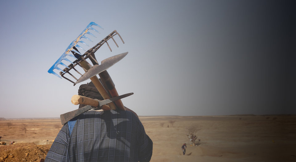 // Main image: Artisanal miner transporting rakes and shovels on gold pits.