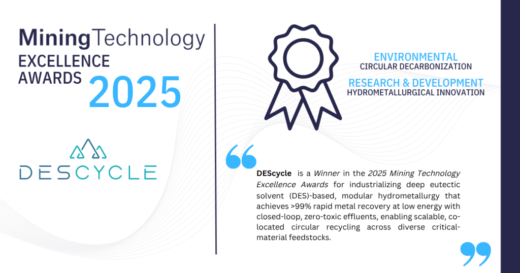 DEScycle is a UK-based deep-tech company pioneering DES-based metal recovery technology and a dual award winner in the 2025 Mining Technology Excellence Awards.