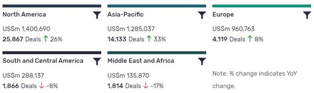 North America is leading in terms of deal value, ($1,400,690m) but its 26% YoY growth has been bested by Asia-Pacific (33%). Europe has also managed to maintain a positive growth, with an increase of 8%.