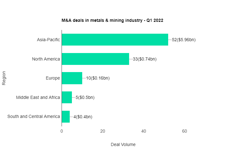 In terms of volumes, Asia-Pacific emerged as the top region for metals & mining industry M&A deals globally, followed by North America and then Europe.
