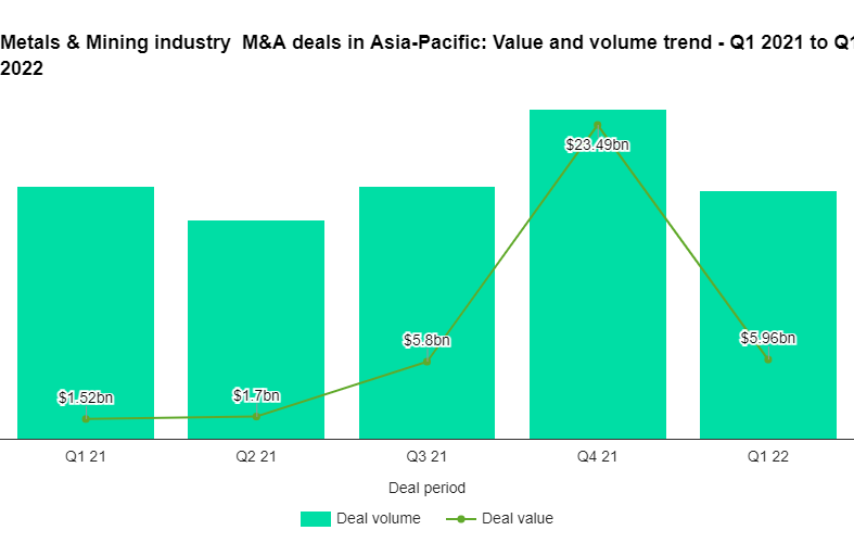 The top five M&A deals in metals and mining industry accounted for 1.2% of the overall value during Q1 2022. The combined value of the top deals stood at $5.27bn, against the overall value of $7.8bn recorded for the quarter.