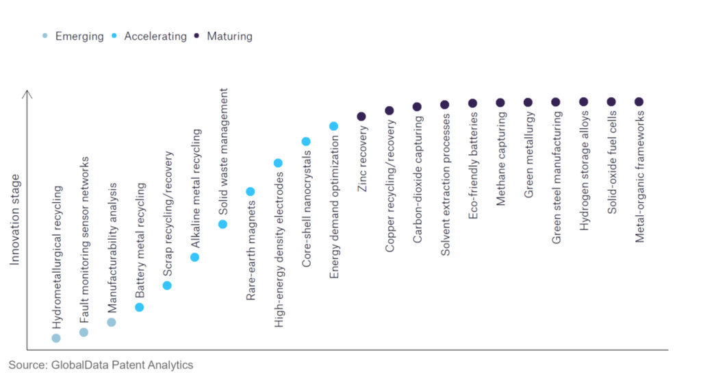 Within the emerging innovation stage, high-energy density electrodes, manufacturability analysis and solid waste management are disruptive technologies that are in the early stages of application and should be tracked closely. Green steel manufacturing, scrap recycling/recovery and core-shell nanocrystals are some of the accelerating innovation areas, where adoption has been steadily increasing. Among maturing innovation areas are green metallurgy and solvent extraction processes, which are now well established in the industry.