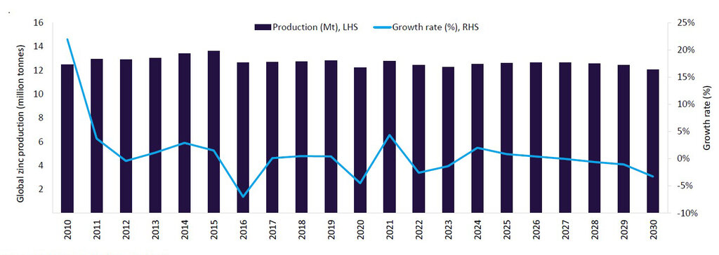 Global zinc production to 2030. Source: GlobalData, International Lead and Zinc Study Group