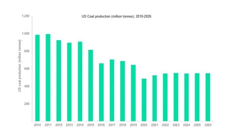 Looking ahead, the US coal mine production is expected to remain flat over the forecast period (2022–26), at a compound annual growth rate of 0.1%, to reach 545Mt in 2026.