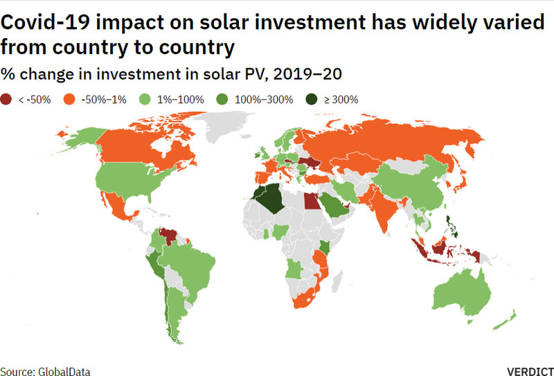 GlobalData’s analysis of changes in solar PV investment between 2019 and 2020 shows significant differences between countries and regions. Significant decline in investment was recorded in Russia, Canada, Mexico and parts of Europe and Asia, while the US, China, Australia, large parts of South America and some parts of Europe and Africa saw an increase in solar PV investment.
