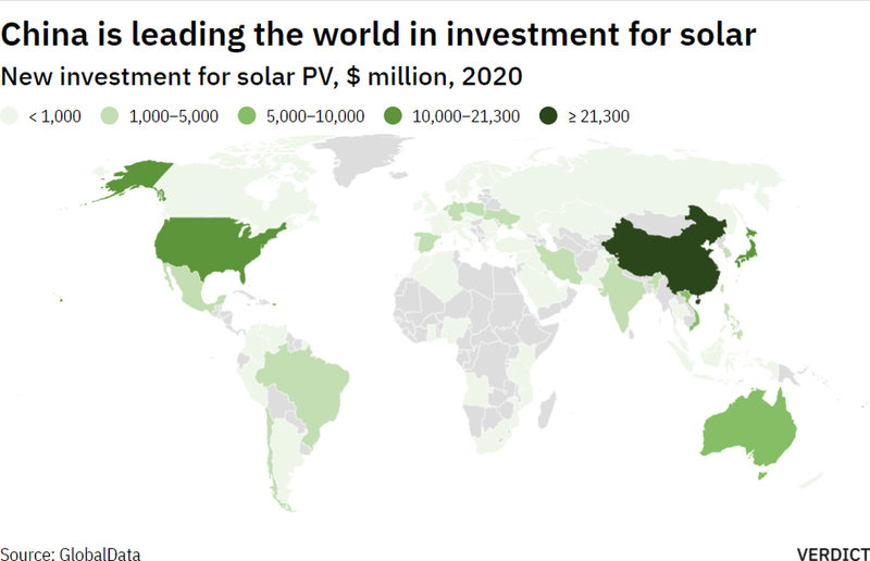 China, the US and Australia were the top three countries for investment in solar PV in 2020.