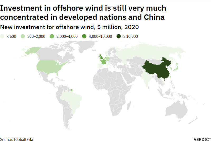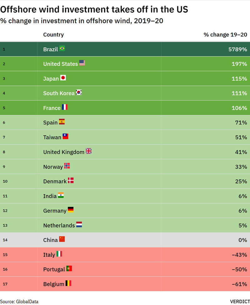 When comparing changes in offshore wind investment from 2019 to 2020, Brazil stands out as a clear leader with an 5789% increase in investment. The country has huge potential for offshore wind but is only beginning to develop its offshore wind sector, with consultations underway to assess the potential impact of offshore wind projects.