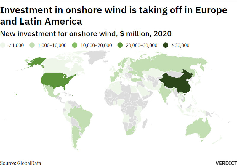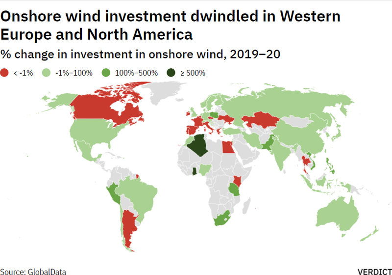 Although investment in onshore wind was strong in many parts of the world in 2020, when compared with 2019 investment levels a significant drop becomes apparent in many countries –most notably, western Europe and Canada.