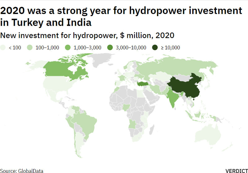 Hydropower investment was strong in China, Turkey, India and Canada in 2020. According to the International Hydropower Association, nearly two-thirds of global growth came from China, which saw 13.8 GW of new capacity added in 2020. Turkey was the only other country adding more than 1GW of new capacity, with 2.5GW installed.