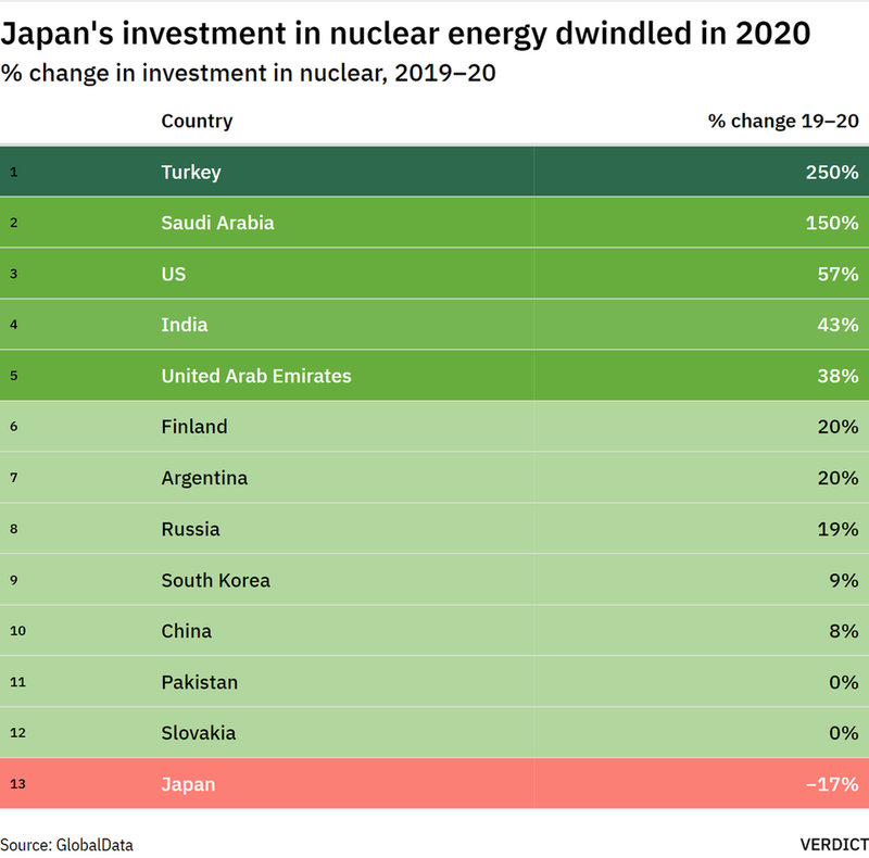 In a comparison of nuclear power investment in 2019 and 2020, a significant decrease of investment in Japan becomes apparent. It is evidence of Japan’s ongoing struggle with nuclear power following the 2011 Fukushima incident, which has led to a decline in nuclear power generation in the years since.
